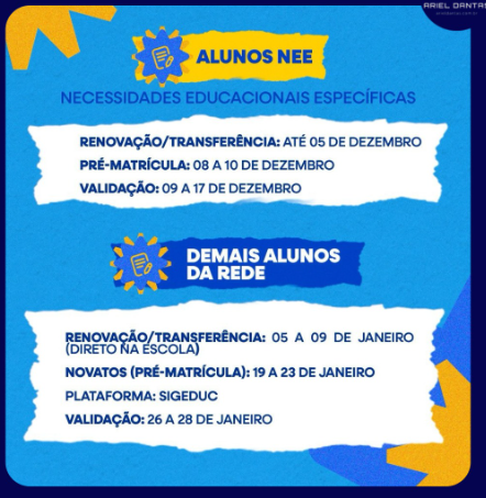 Para os estudantes NEE, Necessidades Educacionais Específicas, a renovação ou transferência segue disponível até 5 de dezembro, a pré-matrícula ocorrerá entre 8 e 10 de dezembro e a validação será realizada entre 9 e 17 de dezembro.