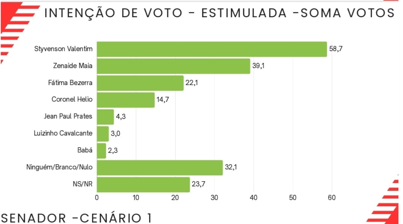 O senador Styvenson Valentim lidera a soma das intenções com 58,7%, enquanto a governadora Fátima Bezerra registra 22,1%. O nome de Coronel Hélio aparece com 14,7%.